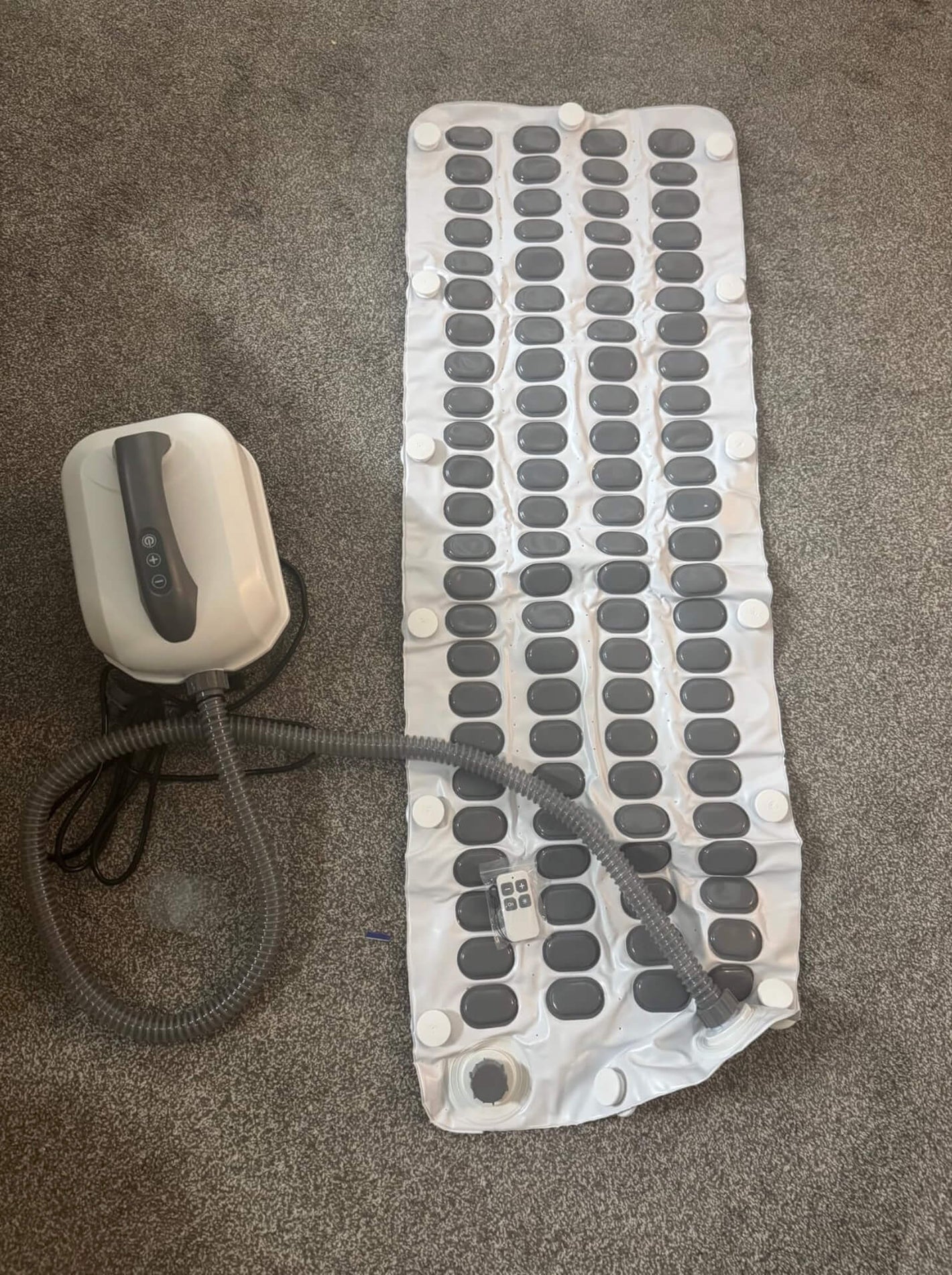 It takes less than two minutes. Just place the mat in your tub, connect the air hose to the motor, plug it in, and fill the tub with warm water. Then hit the power button or remote and relax.