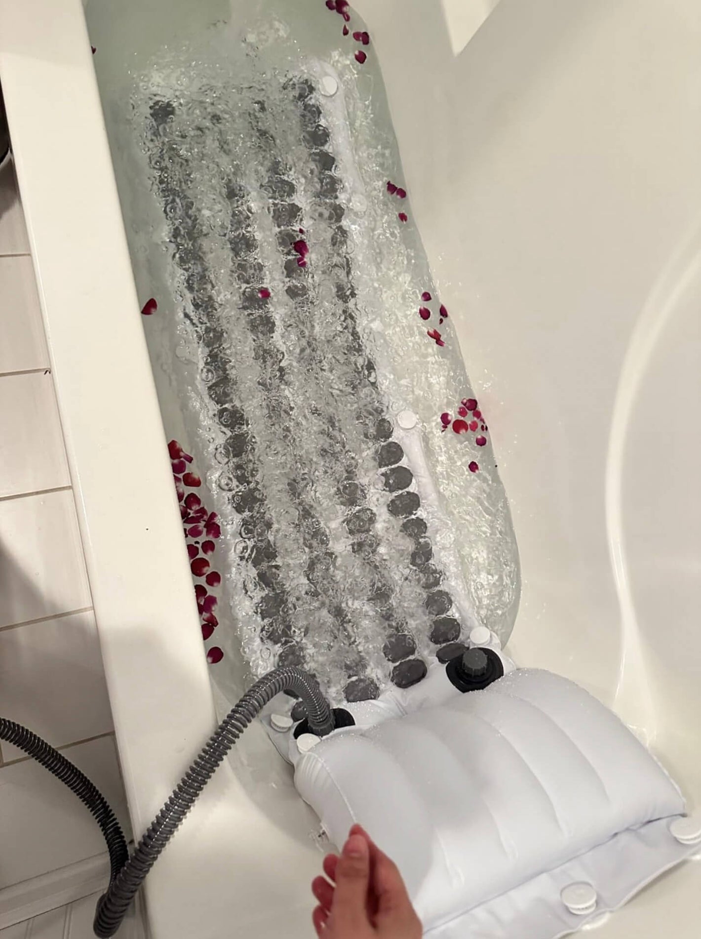 Yes, completely safe. The BubbleMat™ runs on an air-powered system — no electricity touches the water. The motor stays outside the tub and connects with a long air hose, keeping you safe and comfortable during every soak.