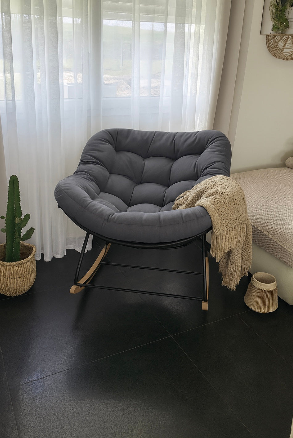 Settle into the oversized cushion and let the gentle rocking motion melt away your stress.
